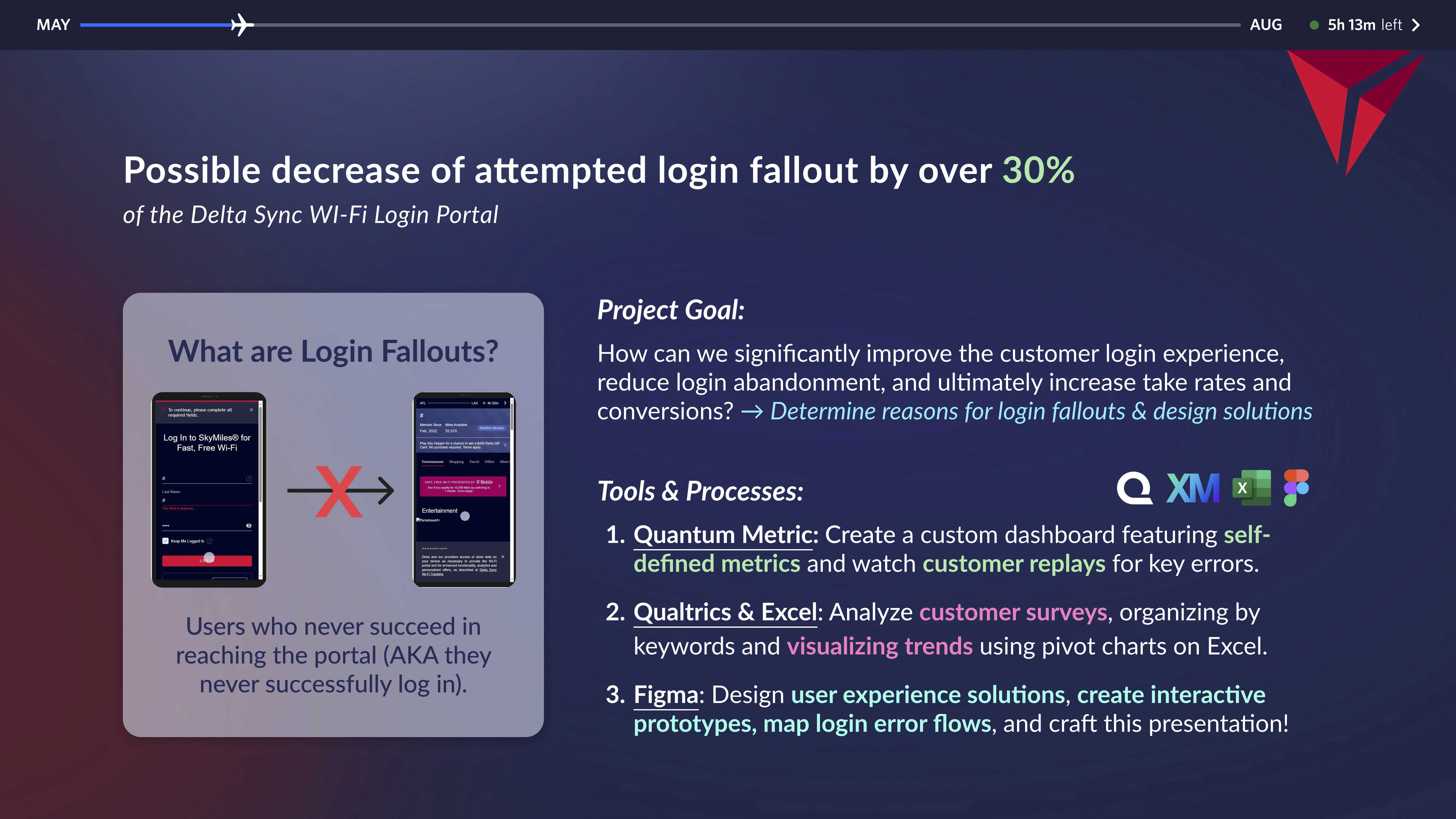 The first step to accessing free Wi-Fi on Delta Air Lines is logging in, so our team wanted to focus data analysis on login fallouts and find design solutions.